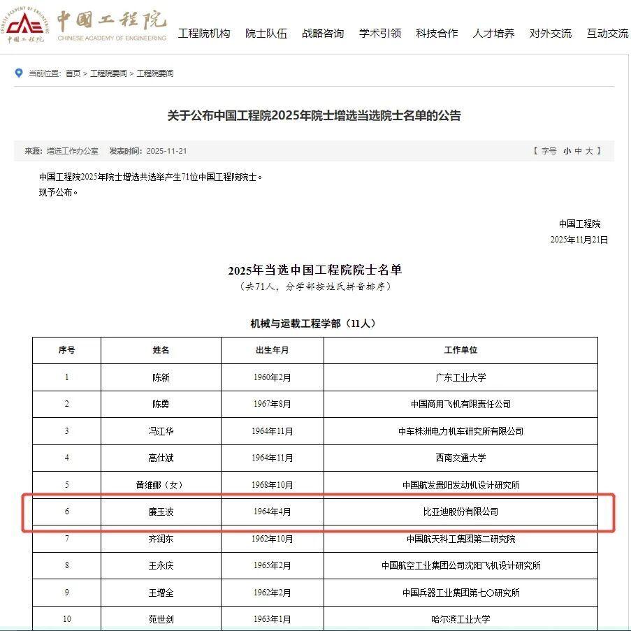 据深圳特区报,现任比亚迪股份有限公司首席科学家、汽车总工程师、汽车工程研究院院长廉玉波成功当选工程院院士,体现了汽车及基础科学产学研融合。